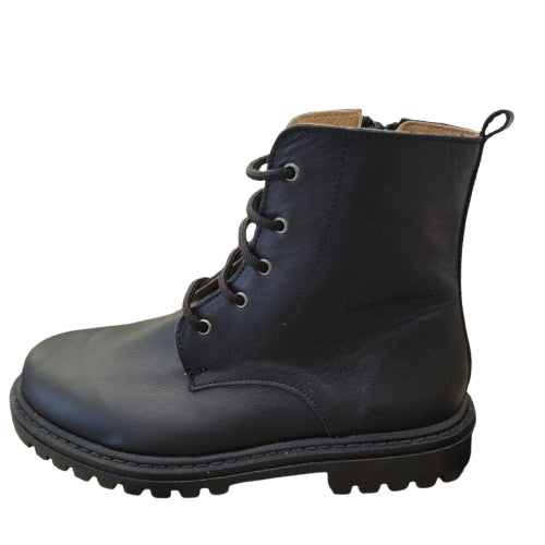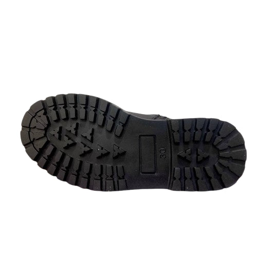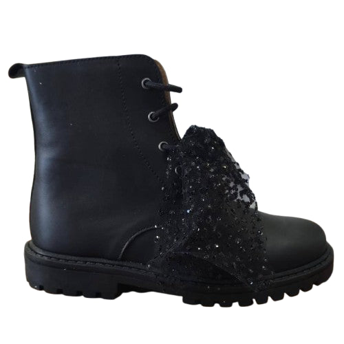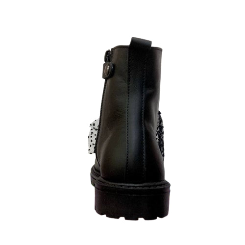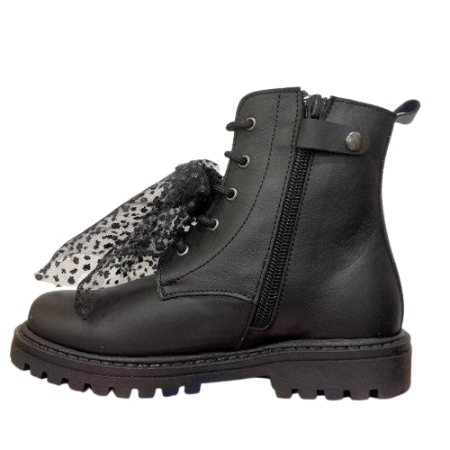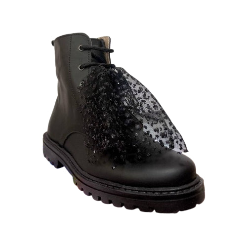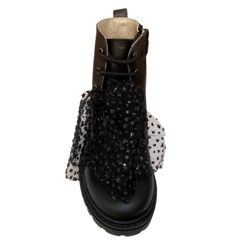 Anfibio in pelle dotato di lacci e zip, impreziosito da un fiocco in tulle decorato con brillantini (rimovibile) per un tocco elegante e scintillante.