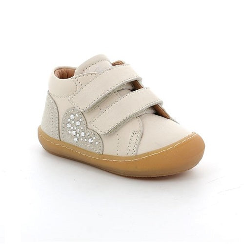 Elegante scarpa primi passi in pelle, dotata di chiusura a strappo per una calzata facile e sicura, arricchita da scintillanti dettagli in strass per uno stile unico.
