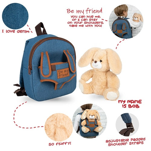 Zainetto in jeans "Be my friend" con un morbido peluche coniglio rimovibile (21cm), perfetto per accompagnarti ovunque con un tocco di dolcezza.